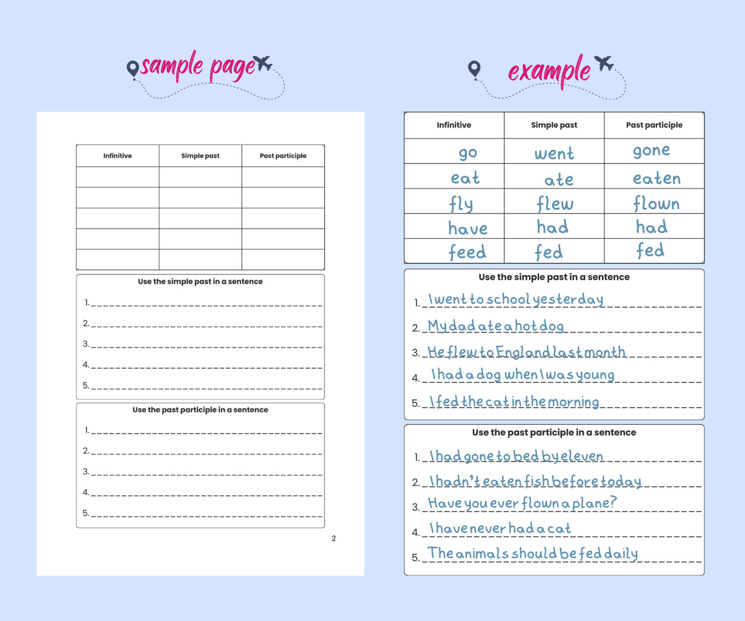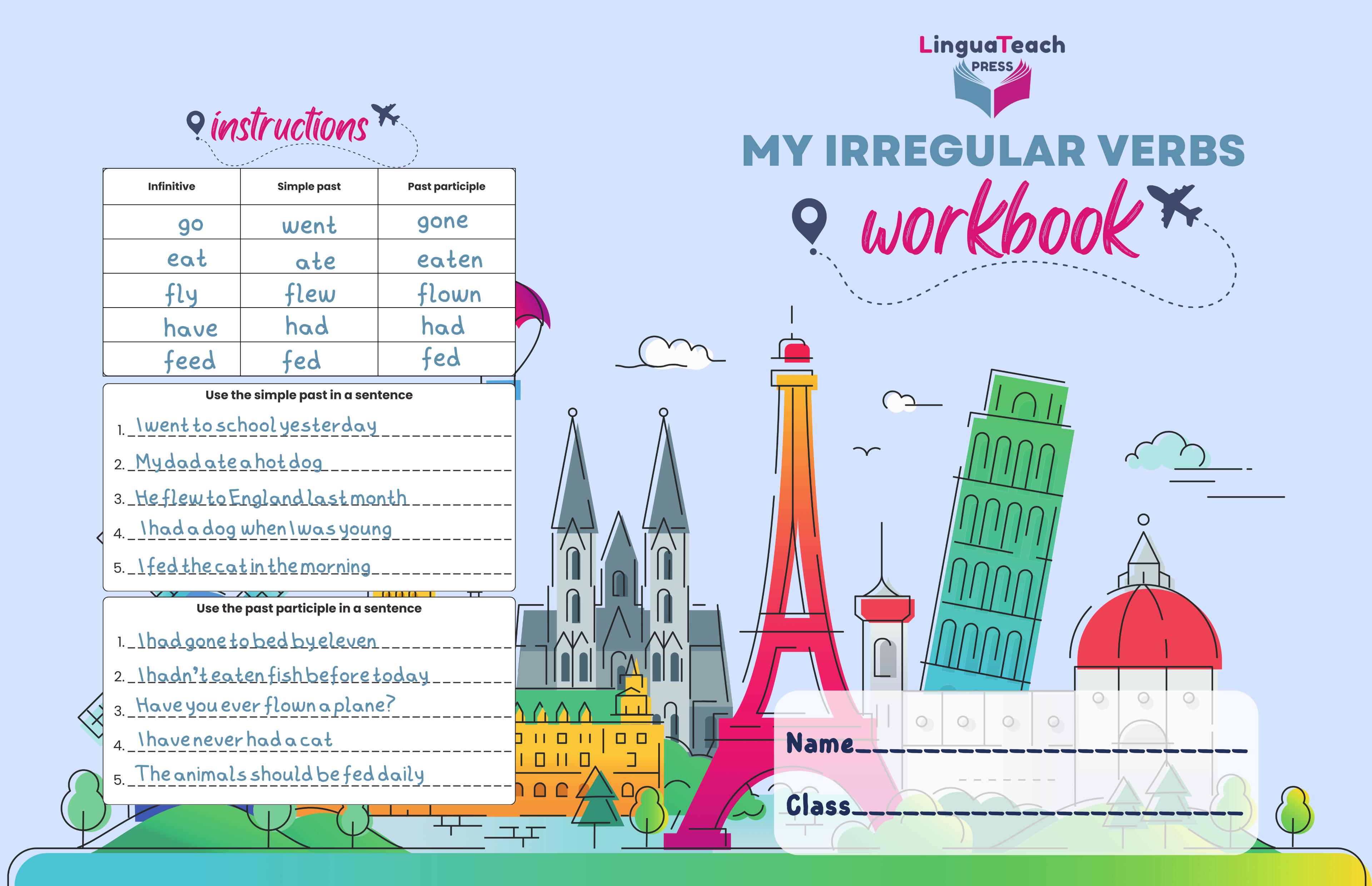 • 75 pages (36 practice spreads covering 12 major tenses)
