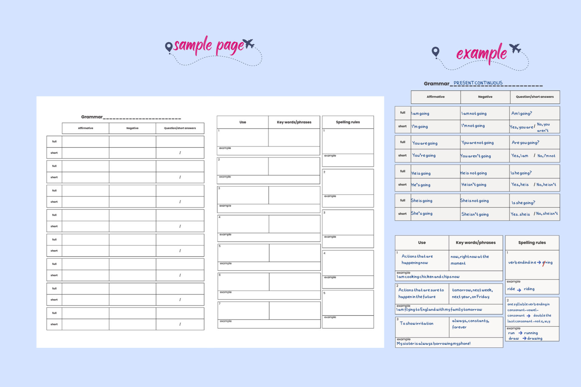 This isn't a traditional grammar book with pre-written explanations. It's a template system where students write their own examples, document their own usage rules, and create their own tense reference. Every page provides the structure (Affirmative/Negative/Questions, Use, Key Words, Spelling Rules). Students provide the thinking.Works alongside any grammar curriculum you're already using. Complements your teaching instead of replacing it.What's Inside: