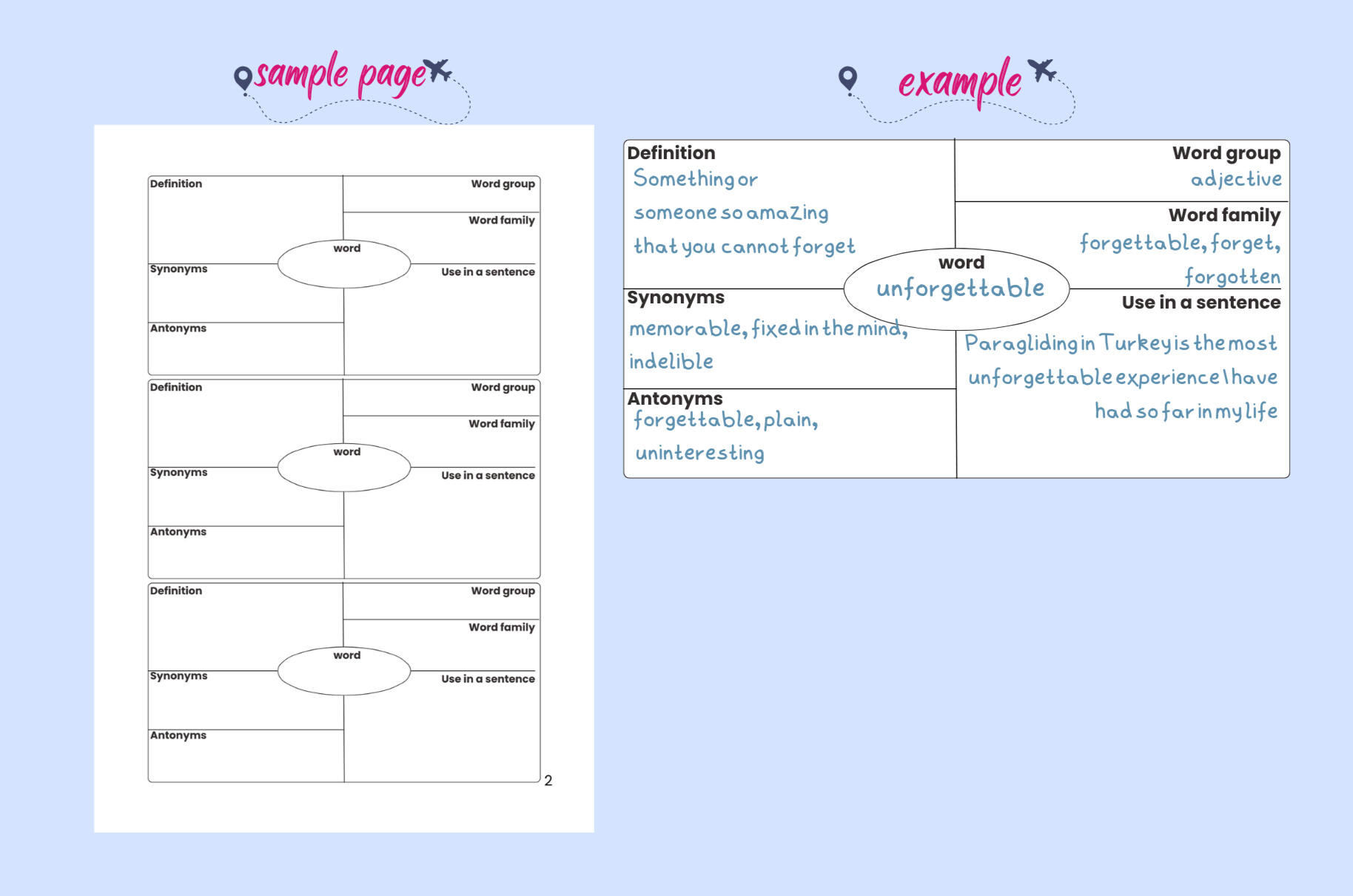 | Focus: | Spelling, Drawing | Sentences Writing | Synonyms, Analysis |