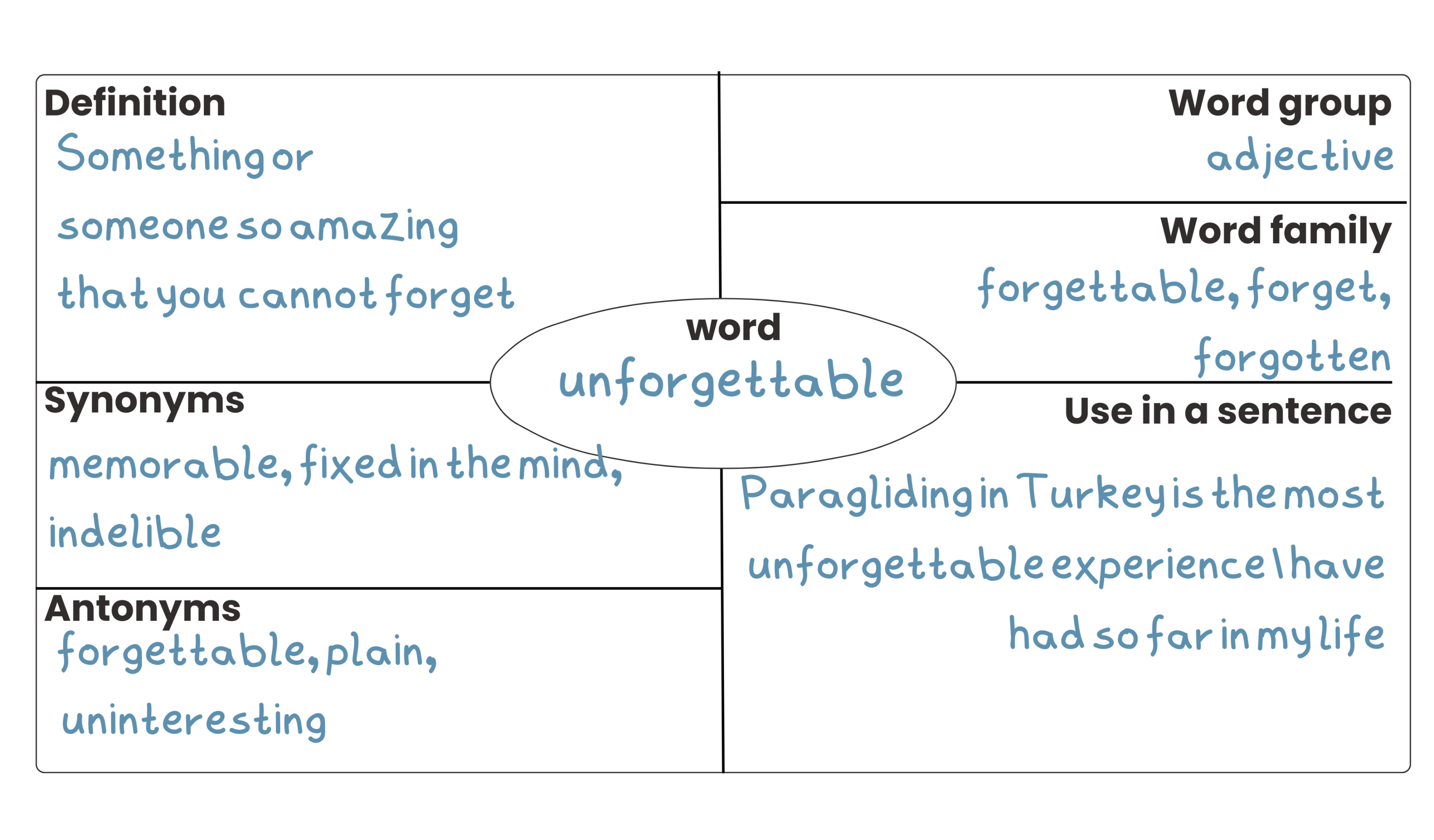 The structure encourages recall, writing, and revisiting — supporting long-term memory rather than short-term completion.