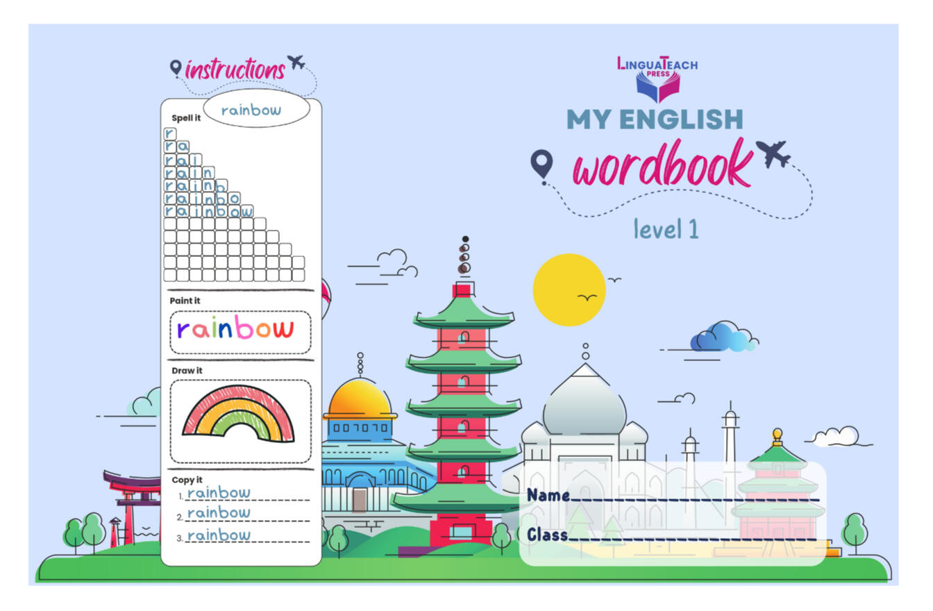Each workbook applies construction-based learning backed by SLA research. Vocabulary books: multiple encounters with each word through spelling, drawing, and contextual use. Grammar books: students build their own tense guides and verb references. Active building leads to lasting retention.