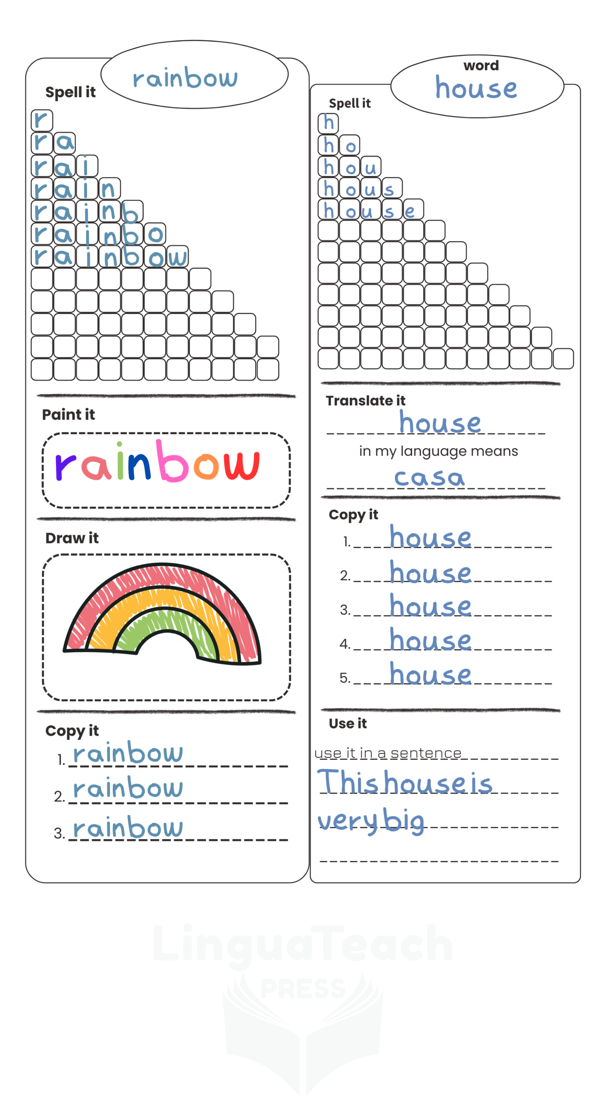 LinguaTeach Press was created by a classroom teacher, for classrooms where real learning matters.Like many teachers, I used to see students complete vocabulary and grammar worksheets perfectly one day and forget everything a few days later. The work was finished. The answers were correct. But the learning didn’t last.Students were copying, not thinking. Practicing, but not understanding.Research has been clear for years: students remember what they construct, not what they passively consume. Learning sticks when students create their own examples, write their own explanations, and actively build meaning. Yet most language workbooks don’t allow space for that kind of thinking.So I designed materials that do.LinguaTeach Press workbooks are structured tools that guide students to build their own vocabulary and grammar references, one concept at a time. Instead of filling in blanks and moving on, students record, organize, revisit, and refine their understanding. Each page becomes part of a personal language system they can actually use.These materials are intentionally simple. They avoid distractions, shortcuts, and over-designed activities. What they offer instead is consistent, meaningful practice, the kind that may look quiet in the classroom, but produces lasting results.LinguaTeach Press is for teachers who believe that:● Progress matters more than speed● Understanding matters more than correct answers● Students deserve materials that respect their intelligenceEvery workbook is designed to support long-term retention, independent thinking, and steady improvement, whether you teach young learners, teens, or adults, and whether you work in private schools, language centres, or public classrooms.This project began in my little classroom in Greece. Today, it supports teachers and learners around the world who are looking for materials that work because they are grounded in how learning actually happens.LinguaTeach Press is not about quick wins.