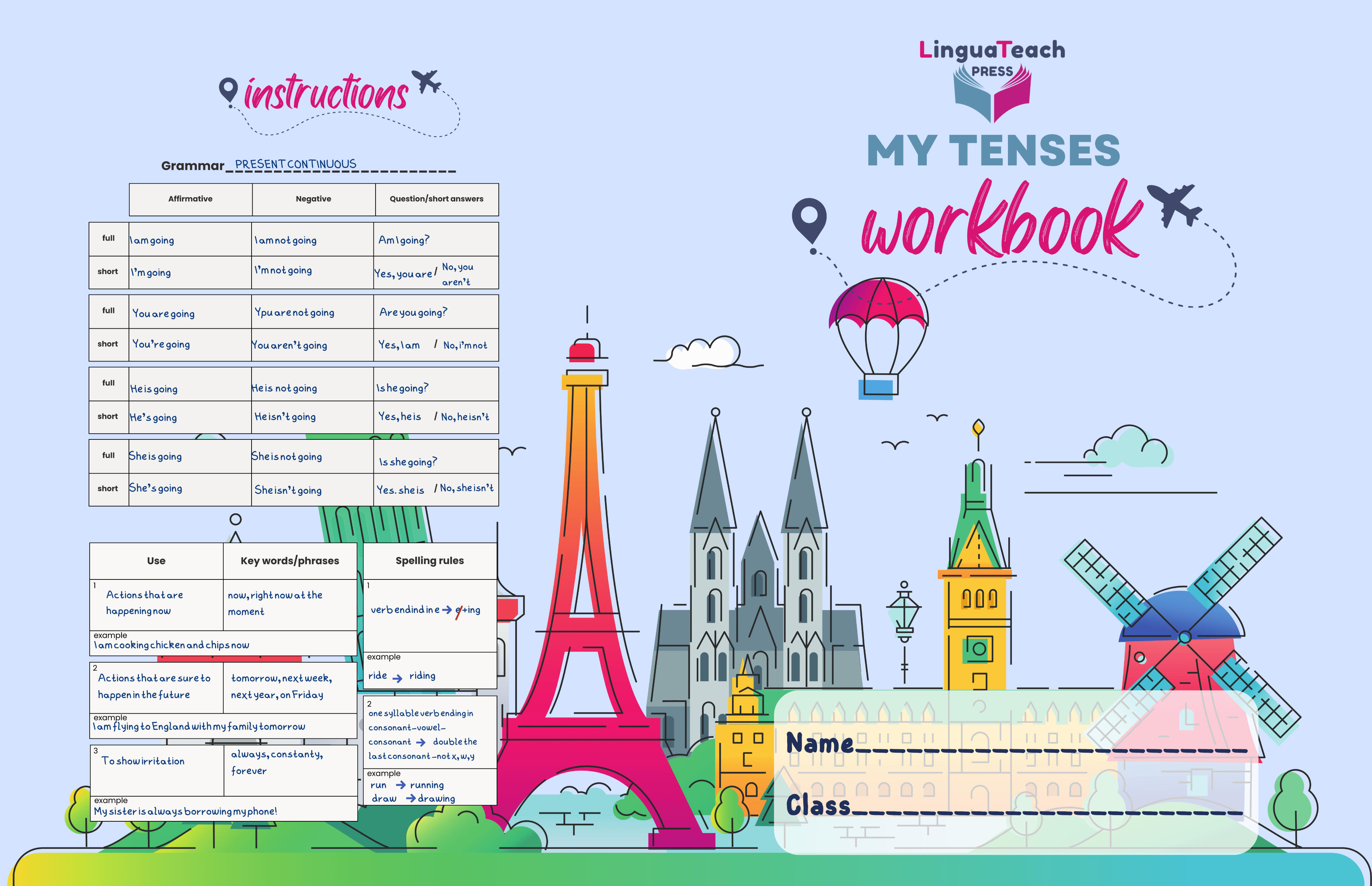 • 75 pages (36 practice spreads covering 12 major tenses)